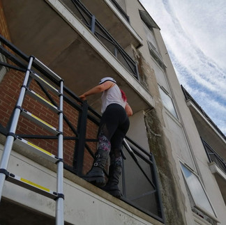 Finally we found the correct balcony. The only way to access it was once again by using a ladder to reach and climb onto the balcony directly below. Sadly, once I got close to the pigeon, I could see that it had not only died but had been dead for some time. We know from experience that it takes many days for tangled birds to die, so we cannot imagine the pain and suffering that this bird experienced, and were so angry and sad that we had not been able to save it in time. How many people had seen it struggling and done nothing? We cut the body loose anyway.